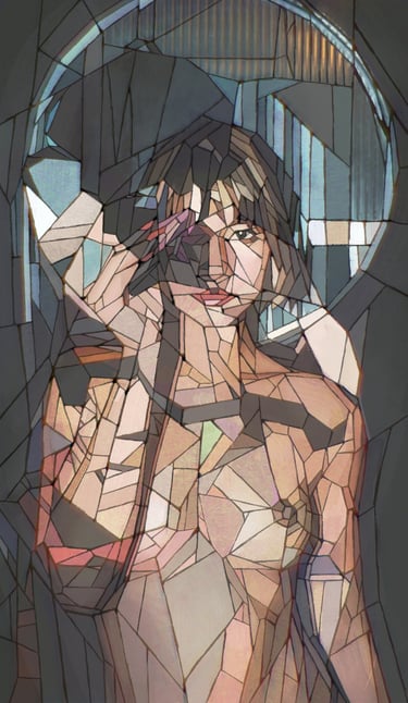 'Fractured Intimacy' symbolizes a new start for me. It's the first artwork where I explore a more sexual motive. I also painted it in a time of great change in my personal life. I just recently divorced from a 4-year-long marriage and embarked on a trip through China. It was also here in China where I later discovered a mosaic factory, where I could transform the digital work into a physical mosaic made out of ceramics. When I visited the factory for the first time, I could instantly feel connected to the place and felt a creative energy. I picked up some ceramic pieces and tried, almost instinctively, to recreate the face of the woman in 'Fractured Intimacy'. I had many digital paintings which I could have chose as a first piece, but for some reason this one stood out to me the most.